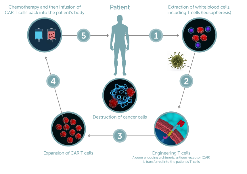 Gene modification cell therapy involves removing cells from a patient and genetically modifying them to introduce a new gene or correct a faulty existing gene. Chimeric antigen receptor (CAR)-T cell therapy is a key example, outlined in the figure on the left. First, T cells are removed from the patient (1) and can undergo pre-manufacturing donor qualification and predictive donor cell analytics to forecast downstream manufacturing success and functional outcomes (1). The cells are then genetically modified through delivery of a new gene using a viral vector (2). This gene modification reprograms the T cells to recognize and attack a certain target cancer cell, thereby promoting specific cancer cell destruction and clearance. The next step in the process is to expand (3) or activate and expand/grow the modified T-cells into a large enough quantity, followed by label-free CAR T cell potency analytics and expansion quality testing (4) prior to infusing the modified cells into the patient (5) to treat their disease, in this case cancer.