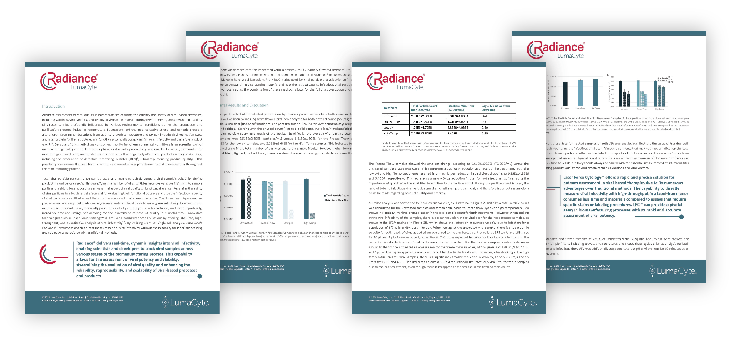 In this technical note, we demonstrate the impacts of various process insults, namely elevated temperature, low pH, and freeze-thaw cycles on the virulence of viral particles and the capability of Radiance® to assess these changes quickly. The Malvern Panalytical Nanosight Pro NS300 is also used for viral particle analysis prior to infection in order to better understand the viral starting material and how the ratio of total to infectious viral particles might change with various insults. The combination of these methods allows for the full characterization and function of a viral product.